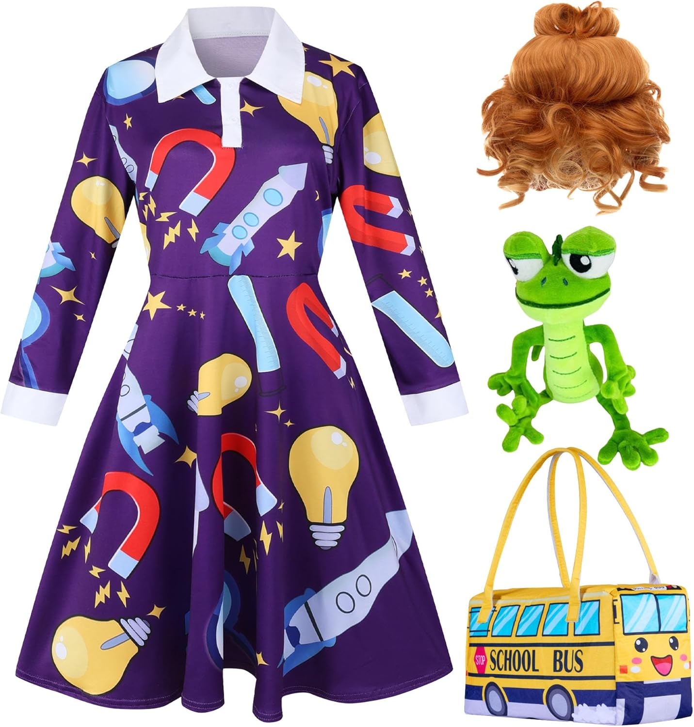 4 Pcs Ms Frizzle Dress Costume Women Teacher Halloween Costume Set with Wig School Bus Bag Plush Toys Accessories Set